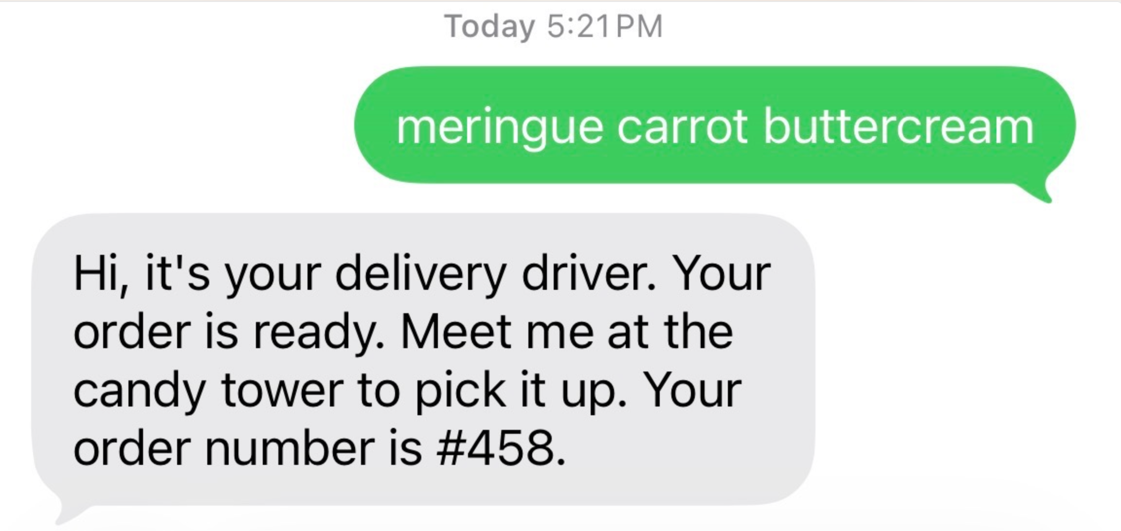 This meant that teams should text Meringue Carrot Buttercream to the delivery driver.